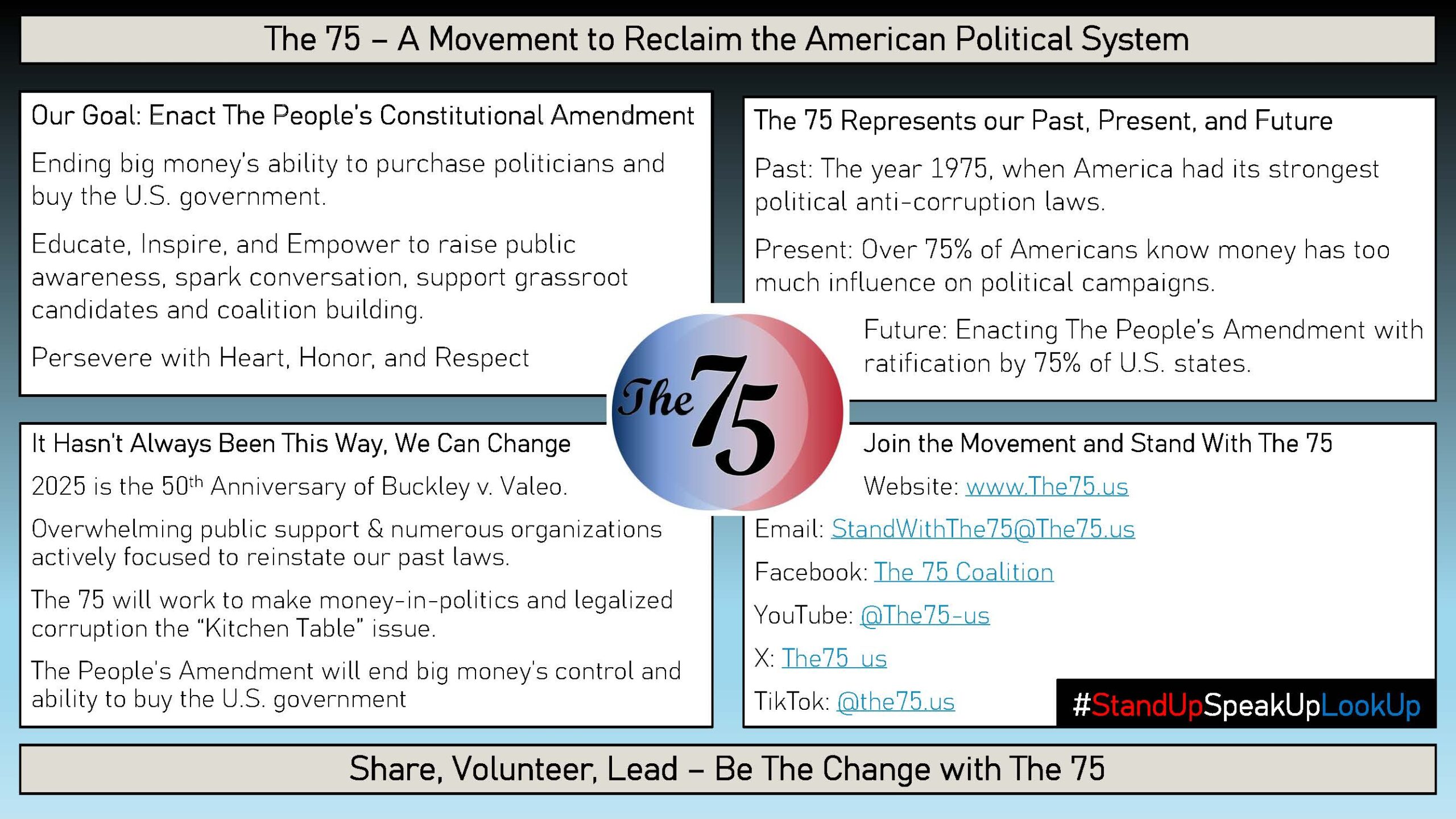- We inspire Americans to Stand Up, Speak Up, and Look Up with social media, community, and branding campaigns. We make big money-in-politics the kitchen table issue.
